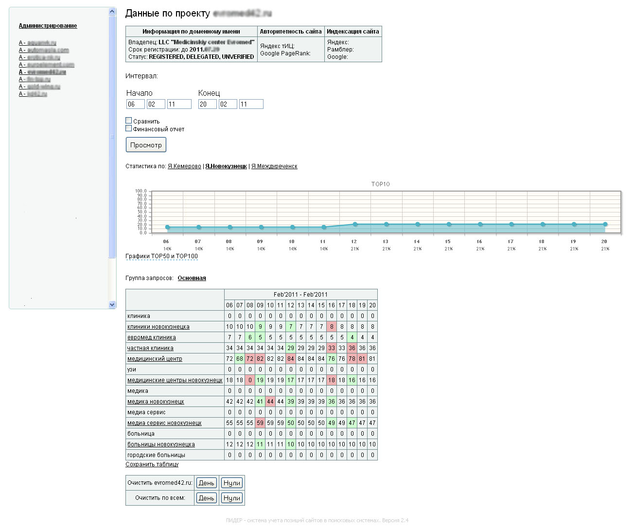 Это сервис ежедневного мониторинга позиций ваших сайтов, сделанный с учетом потребностей сео-специалистов. Вы вносите в систему свои проекты (сайты), указываете ключевики, поисковики (с регионами) и далее ежедневно смотрите динамику изменения позиций. При необходимости можно указать стоимость ключевиков для ваших клиентов и в зависимости от ТОПа будет расчитана стоимость продвижения за период. Также есть доступ для Ваших клиентов - они видят только свои проекты. Вы можете смотреть логи их посещения.
